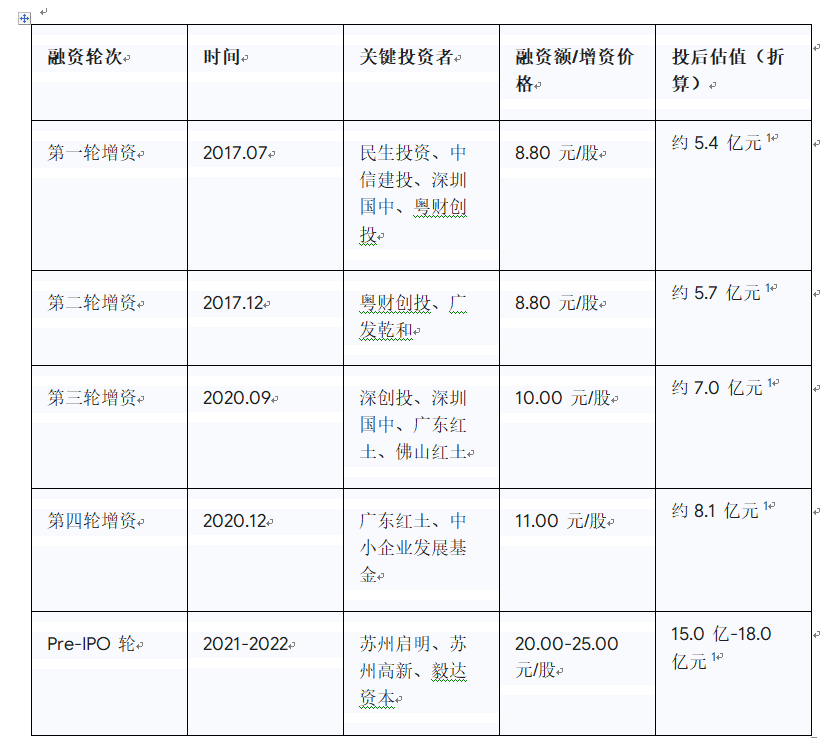 2017年7月,公司第一轮增资以8.8元/股引入民生投资、中信建投等机构,投后估值约5.4亿元;同庚12月第二轮增资,粤财创投加码和洽广发乾和入局,价钱不变,估值升至约5.7亿元。2020年融资提速,9月第三轮以10元/股引入深创投、广东红土等国资机构,估值达7亿元;12月第四轮,广东红土追加投资,和洽中小企业发展基金以11元/股注资,估值增至8.1亿元。2021-2022年Pre-IPO轮,以20-25元/股引入苏州启明等机构,估值达15亿-18亿元。