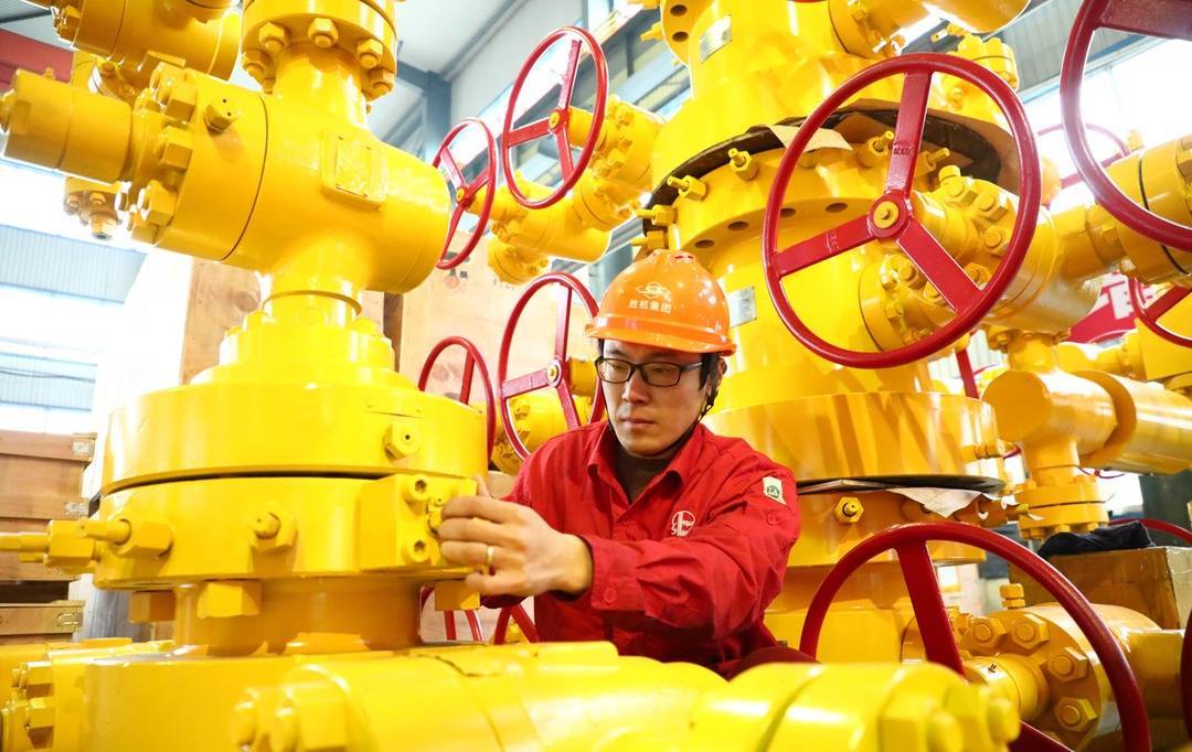 奏凯油田胜机石油装备有限公司井控开荒厂内,工东谈主正在对采油(气)井口开荒进行搜检。(缪宏伟 报谈)