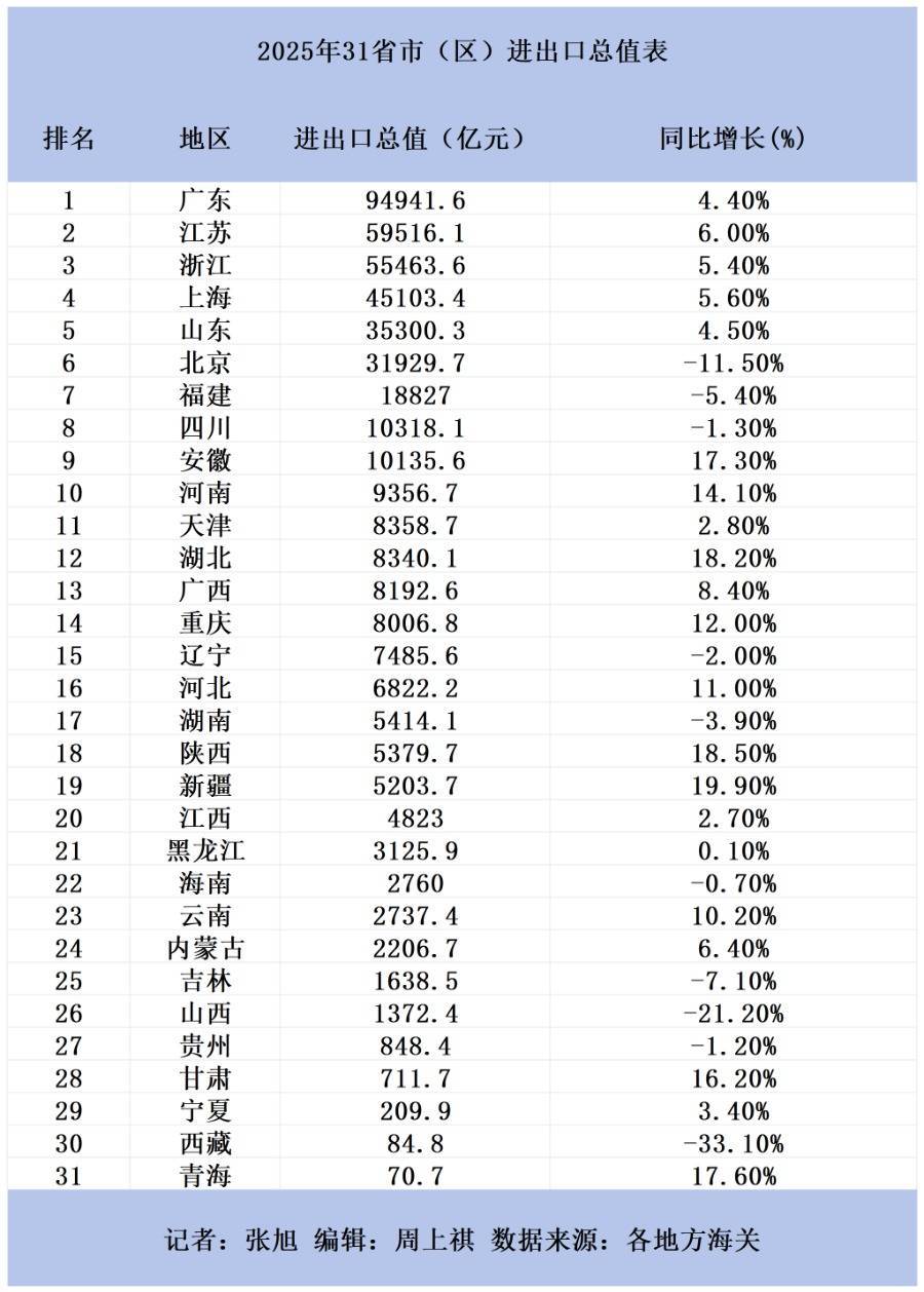21世纪经济报谈 记者张旭 北京报谈开云体育(中国)官方网站 近日,31个省份2025年外贸数据延续公布。2025年,天下出进口总值达45.47万亿元,增长3.8%,外贸总值冲破万亿元的省份增至9个。 从总值来看,广东凭借9万亿元的成绩赓续领跑全部省份。江苏、浙江、上海、山东、北京分列第二至第六位,外贸总值在3万亿元至6万亿元之间。安徽以10135.57亿元的成绩,成为中部首个、天下第九个外贸总值破万亿元省份。 从同比增速来看,共有17个省份跑赢3.8%的“天下线”,21个省份终了同比正增长,新疆增长19.9%排行天下第一。而在外贸大省中,安徽以17.3%增速领跑。也曾的“中部外贸第一省”河南,则以14.1%的增速,位居十大外贸省份第二。2025年,河南出进口总值达9356.73亿元,有望在2026年冲破万亿元大关。 对于广东外贸成绩单,广东外语外贸大学广东国际计谋究诘院实施院长、教育韩永辉向21世纪经济报谈记者暗意,广东领有天下最完备的制造业体系和产业链配套能力,这是其外贸长期领跑的根底救济。民营经济活跃且外贸主体捏续扩容,造成强壮的商场韧性。 此外,广东在跨境电商、外洋仓、保税物流等新式买卖步地上最初天下,同期依托粤港澳大湾区和自贸检修区真切轨制型绽放,通关效果栽种、航路汇聚加密、规则联络加速,为外贸“量稳质提”提供了系统性救济。  广东九万亿居首2025年,广东货品买卖出进口9.49万亿元,同比增长4.4%,创历史年度新高。其中,出口6.03万亿元,同比增长2.5%;进口3.46万亿元,同比增长7.8%。其出口、进口规模均居天下首位,分散占天下总量的22.4%和18.7%。 广东外贸规模照旧连续40年居天下各省市首位,对天下外贸增长的孝敬率达24.1%。“2025年广东外贸吩咐外部压力、克服里面费事,规模稳、结构优、动能新,终清澈‘量稳质提’。”海关总署广东分署副主任张柯说。 濒临外部不笃定性,不少企业向外诱惑多元商场。广东对中亚五国、非洲、中东等新兴商场出进口分散增长23.6%、10.7%、8.5%,均高于广东举座增速;对共建“一带一起”国度出进口3.66万亿元,增长5%。 为得志不同商场的不同需求并加强耗尽者黏性,广东出口结构捏续向新向优,加速构建新质分娩力。2025年,广东的工业机器东谈主、无东谈主机、3D打印机、农业机械等居品出口均终了较快出口,高端化、智能化、绿色化特征愈发明显。 广东的新式业态不休扩容,也为外贸增长提供新动能。2025年,保税物流全年出进口1.93万亿元,增长9.1%,占出进口总值的比重初次冲破20%;广东全年跨境电商外洋仓出口增长9.8倍,广东“买环球、卖环球、通环球”的速率更快、本钱更低。 国际航空要津的树立为跨境电商提供强壮救济。把柄民航局等部门发布的《对于鼓舞国际航空要津树立的诱惑见地》,坚定化北京、上海、广州国际航空要津全主义派系复合型功能。 在广州白云国际机场,日均出进口货品超4000吨,是广州连通世界的“空中桥梁”。2025年,每天都有上百万件跨境电商包裹,从这里飞往外洋。 2025年底,广州新机场技俩也获取国度发展转变委肃穆批复。广州新机场建成后,粤港澳大湾区将再添一座要津机场,经济效益愈加光显。 值得一提的是,2025年,广东外贸进口增长7.9%,增速在天下外贸大省中排行第一。对于进口情况的变化,韩永辉向21世纪经济报谈记者指出,广东正加速向高端制造和产业链上游蔓延,进口结构突显产业升级导向。 2025年,广东对中央经管部件和集成电路等高附加值电子零部件进口大幅增长,反馈出土产货电子信息、东谈主工智能、新能源汽车等先进制造业对中枢元器件的苍劲需求,评释广东企业正从拼装加工向研发策画和系统集成次第跃升。 能源进口权贵膨大,救济绿色低碳与产能平定双重目的。制品油和原油进口量分散增长一倍和15.4%,既体现广东手脚制造业大省对能源保险的刚性需求,也与其鼓舞石化产业优化布局、树立国度级绿色能源基地的计谋相契合,为工业体系提供平定能源基础。 “广东的外贸结构由‘猛进大出’向‘优进优出’转型,彰显高质料发展见效。进口增长不仅奇迹于出口导向型分娩,更体现出对环球优质要素资源的整合能力增强,通过精确引进要害时刻与能源资源,广东正构建更具韧性、更高附加值的绽放型产业生态。”韩永辉说。 山东位次超越北京在广东之后,分散是第二位的江苏(59516.1亿元),第三名的浙江(55463.6亿元),第四名的上海(45103.4亿元),第五名的山东(35300.3亿元)。 与2024年比拟,广东、江苏、浙江、上海连续两年稳居前四。山东省排行高潮一位至第五,是外贸前十大省中独一位次高潮的,北京则下落一位至第六。 2025年,民营经济为山东外贸孝敬了92.9%的商场主体、76.3%的出进口值、105.9%的外贸增量。其中,民营企业出口占全省出口总值的比重达到77.4%、进口占74.4%。“如今,山东民营企业照旧终清澈普遍越过,开脱了规模小、时刻低的固有印象,出进口值卓绝100亿元的民营企业达22家。”青岛海关副关长朱宏说。 从主要买卖商场看,2025年山东对欧盟、俄罗斯、巴西出进口分散增长5.1%、4.4%、7.1%。对共建“一带一起”国度出进口2.26万亿元,增长7.6%,占全省出进口总值的64.1%。其中,对非洲、中东地区、中亚五国出进口分散增长38.6%、18.5%、55.2%。 2025年,山东省机电居品出口初次冲破万亿大关,达1.06万亿元,增长8.7%,占出口总值的48.9%。其中,汽车、