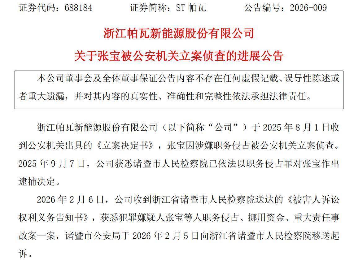 ST帕瓦(688184)2月6日开yun体育网晚间公告开yun体育网,公司于当日收到浙江省诸暨市东谈主民稽查院投递的《被害东谈主诉讼权益义务见知书》,获悉违章嫌疑东谈方针宝等东谈主职务侵占、挪用资金、要紧包袱事故案一案,诸暨市公安局于2月5日向浙江省诸暨市东谈主民稽查院移送告状。  ST帕瓦示意,律例公告露出日,公司分娩场所情况一切正常,上述事项不会对公司日常场所活动产生要紧影响。 2025年8月1日,ST帕瓦收到公安机关出具的《立案决定书》,张宝因涉嫌职务侵占被公安机关立案捕快。2025年9月7日,ST帕瓦获悉诸暨市东谈主民稽查院已照章以职务侵占罪对张宝作出逮捕决定。 更早之前,2025年5月22日,ST帕瓦公告,收到公司董事长、总司理张宝的书面离职讲明,张宝因个东谈主躯壳原因辞去公司董事长、总司理职务,并不再担任公公法定代表东谈主,离职后仍担任公司董事、政策委员会主任委员、薪酬与考核委员会委员职务。 2025年6月,张宝出具《资金占用情况阐发》,其通过供应商占用上市公司资金1.41亿元,占用销售货款4991.88万元,所有占用公司资金本金1.91亿元。上述占用资金主要用于其本东谈主耗尽、投资、存于本东谈主或本东谈主指定账户。 贵府露出,张宝出身于1971年10月,中南大学冶金物理化学博士、化学工程与本事博士后。其历任中南大学助教、讲师、冶金科学与工程学院副连续员、校团委布告、冶金与环境学院党委布告、博士生导师等职务。2018年7月起任ST帕瓦董事、总司理,2022年10月起任公司董事长。 律例2025年9月末,张宝捏有ST帕瓦股票1656万股,捏股比例10.41%,系公司第二大推进。据ST帕瓦2024年年报,张宝往时税前薪酬为120.08万元。 ST帕瓦主要从事医药居品的研发、分娩、销售及关系健康就业。 由于审计机构天健司帐师事务所(绝顶浮浅合资)对公司2024年度财务讲明里面律例出具了狡赖主张的审计讲明,ST帕瓦股票于2025年5月6日被引申其他风险警示。 ST帕瓦1月19日露出事迹预报,预测2025年年度竣事包摄于母公司通盘者的净利润亏空5.5亿元—7亿元,与上年同时(法定露出数据)比较,将减亏2650.15万元到1.77亿元。算上2023年,ST帕瓦3年累计亏空逾15亿元。 2025年亏空主要系公司为优化业务质地,主动对销售订单结构进行精简与优化,但由于公司固定财富折旧等固定本钱仍然较高,产销量较低未能有用分担固定本钱。此外,公司基于严慎性原则,对部分存货、固定财富、在建工程、无形财富、应收账款等计提减值准备,对当期利润有较大影响。 二级市集上,2月6日,ST帕瓦跌0.10%,收报10.46元,市值为16.6亿元。 举报/响应
